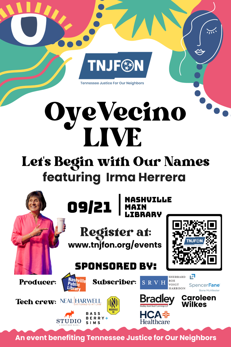 All proceeds from Oye Vecino LIVE will contribute to the Tennessee Justice for Our Neighbors mission to provide free or low-cost, compassionate immigration legal services to immigrants, educate the public about issues related to immigration and advocate for immigrant rights.